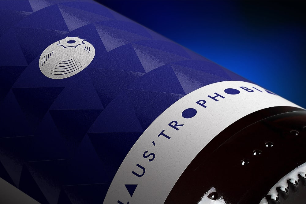 The label design is unconventional, reflecting the beer’s unique character. Blueberries are depicted in a confined space, symbolizing claustrophobia. UV varnish highlights triangular shapes reminiscent of forest trees and subtly hints at blueberry harvesting. The combination of matte paper and UV varnish is a rare solution in this category.