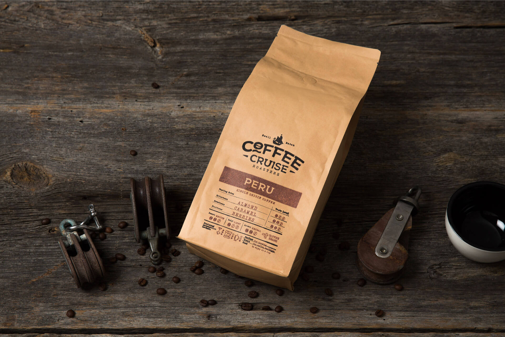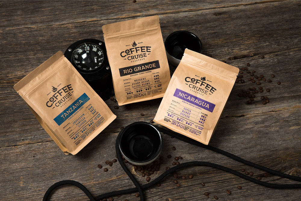 The Coffee Cruise – Small Batch Roastery brand was created as a guide, allowing customers to travel the world through a cup of coffee. Craft paper bags were selected and decorated with handmade stamps, preserving imperfections and the feeling of craftsmanship. Three main coffee characteristics—fruitiness, sweetness, and bitterness—are highlighted on the front, with additional indicators helping customers easily find their desired flavor.