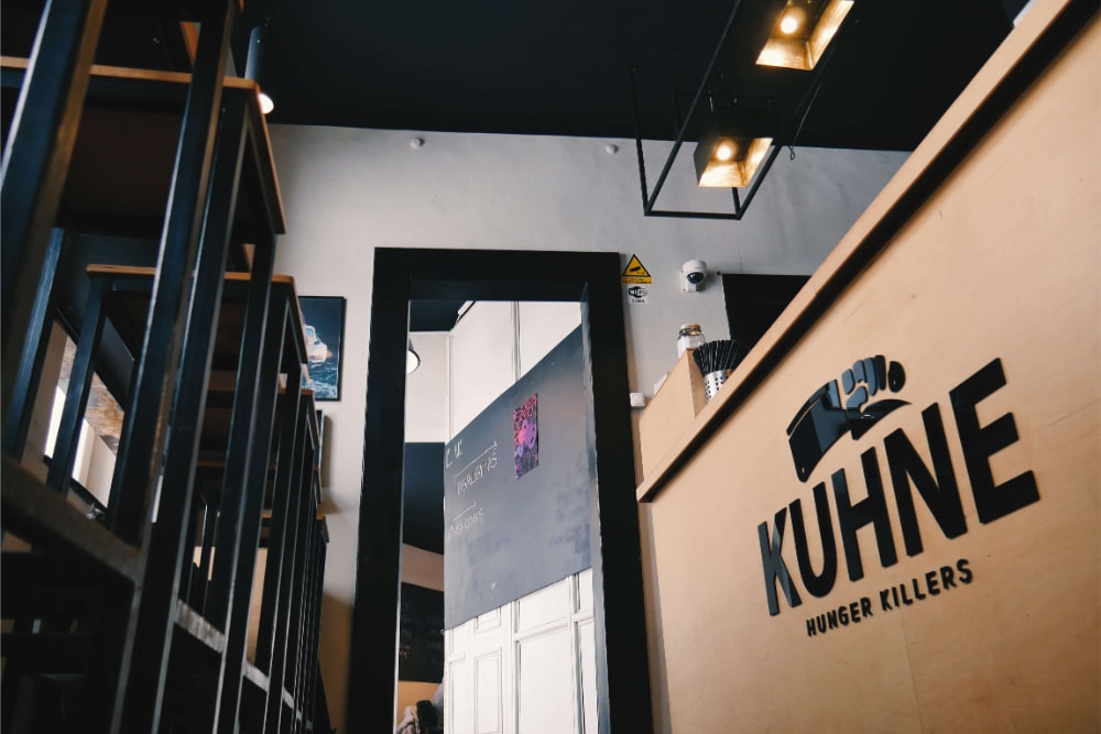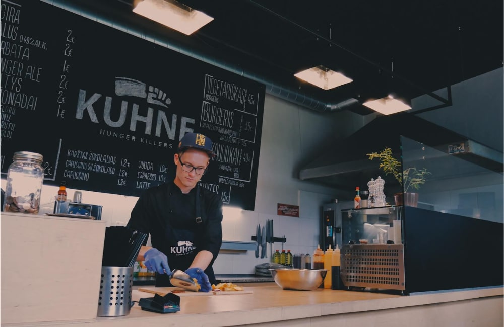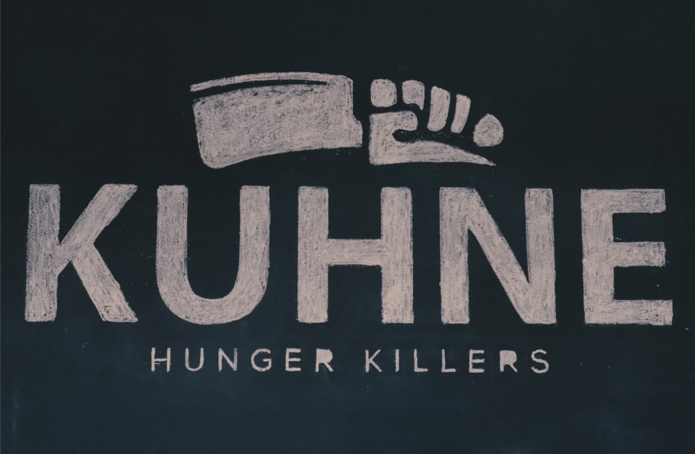 Inspired by Lithuanian Soviet-era kitchen traditions—when ideas of freedom and parties were born in Kaunas—the name KUHNE was created (from the Russian “kuhnja” and the German “küche”). Following market trends and a focused menu of pork ribs and pulled-pork burgers, a meat cleaver symbol was used in the logo to emphasize fresh meat. The slogan “Hunger Killers” naturally reinforced the bold and aggressive brand character.