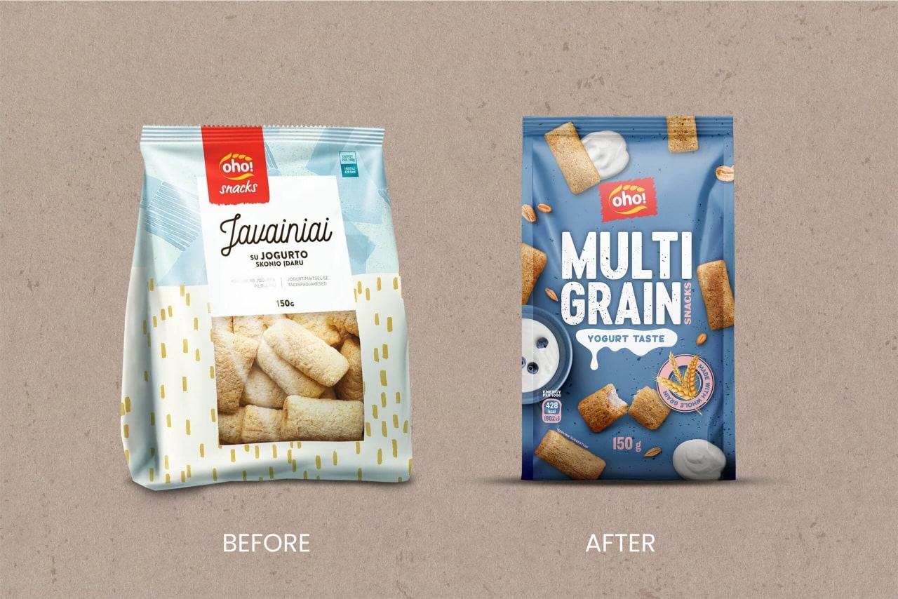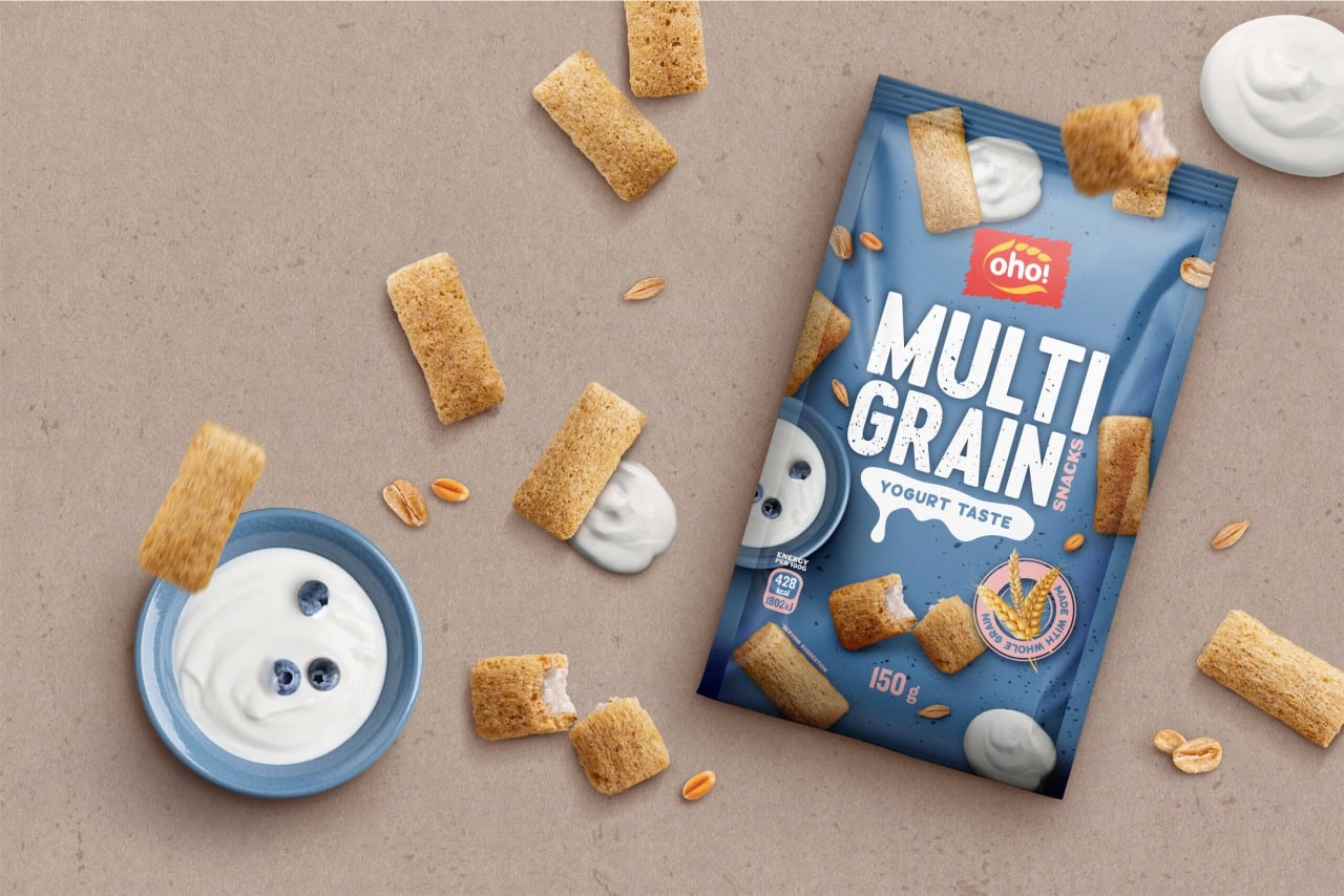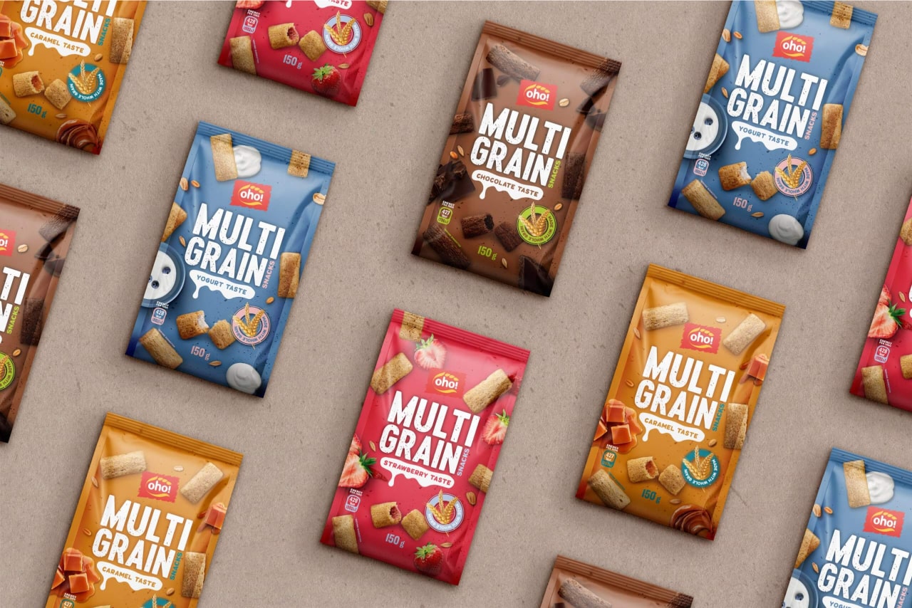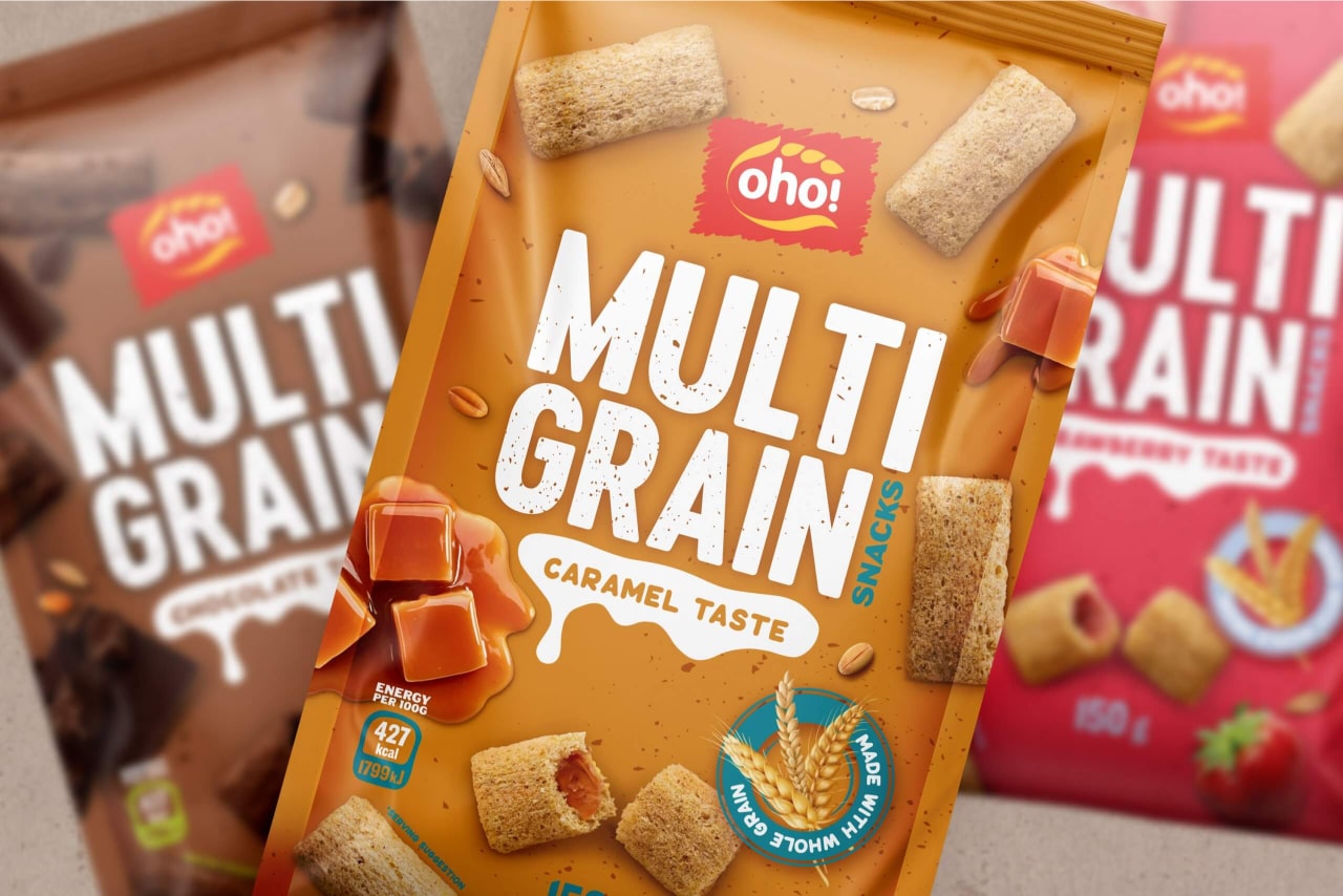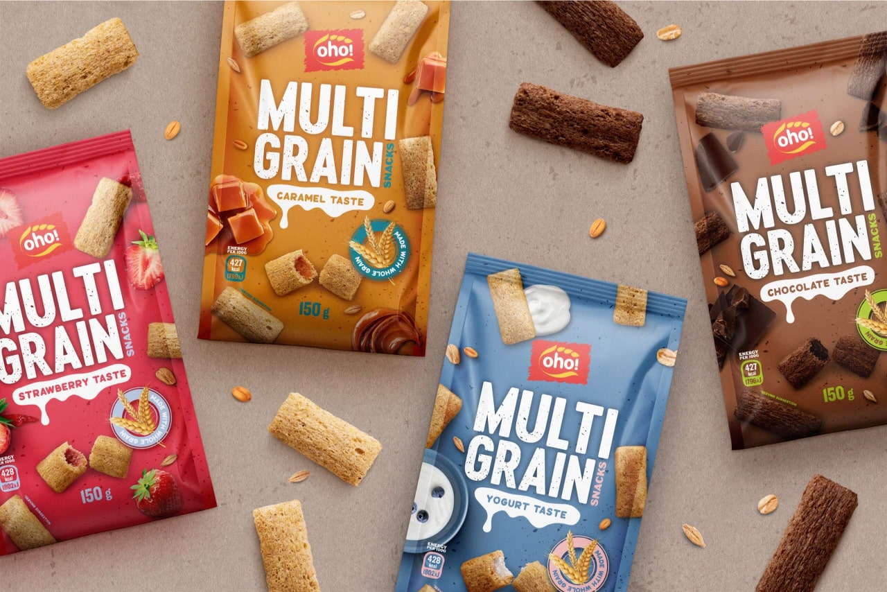 OHO MULTIGRAIN snacks are made from whole grains and combined with healthier ingredients to create a tasty, healthy, and crunchy snack. The new OHO MULTIGRAIN packaging features a playful design that makes the product visually appealing and clearly communicates what it is.